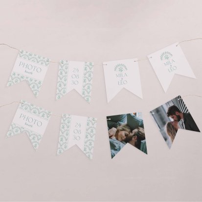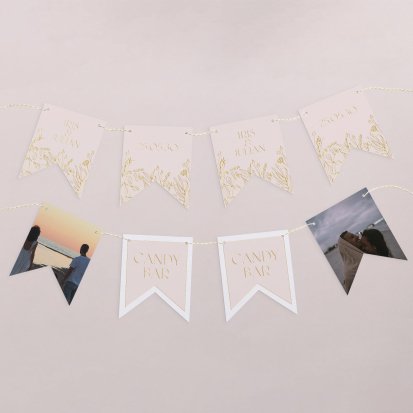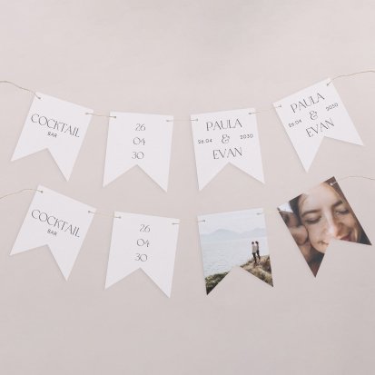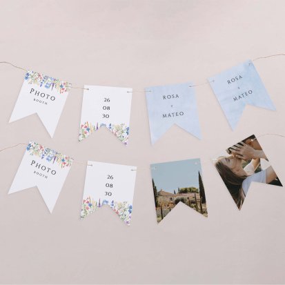 Añade un toque festivo y bohemio a tu recepción con nuestras guirnaldas de banderines personalizables.