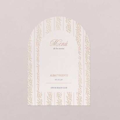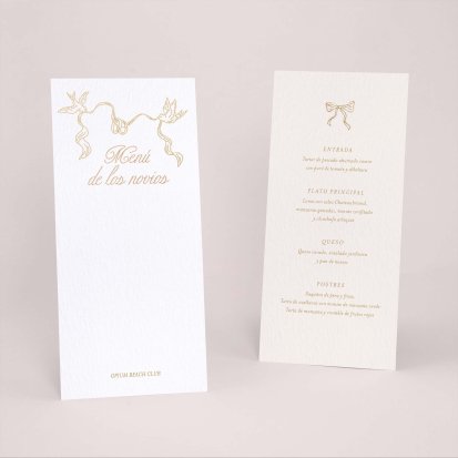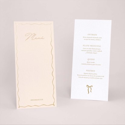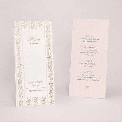 En un enlace nupcial todos los detalles son importantes. ¡También el menú de boda! Ya que en él recae la presentación de nuestro banquete. Si ya tienes decidido qué menú vas a servir en tu boda, solo te queda seleccionar un modelo de menú de boda físico para los invitados. Quedará sensacional si lo combinas con la invitación de boda.