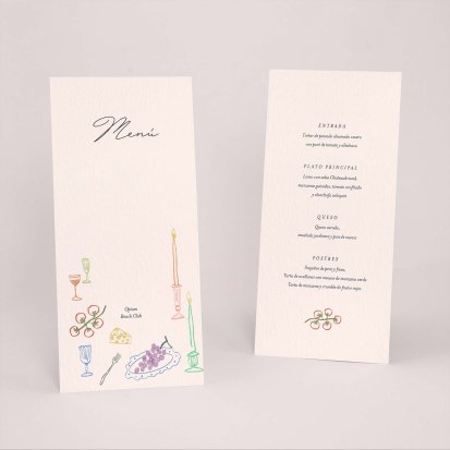 Una vez decidido el menú de tu boda. Imprímelo a juego con tu invitación de boda. Presentados en las mesas, completarán de forma ideal la decoración y vuestros invitados, se llevarán un bonito recuerdo de vuestro convite. Os aconsejamos un menú por persona: puedes colocarlo en el centro del plato junto con el marca sitio.