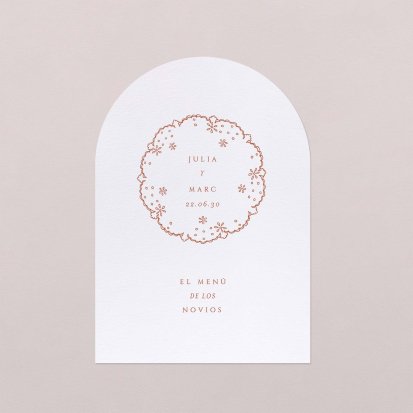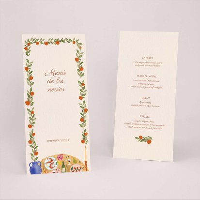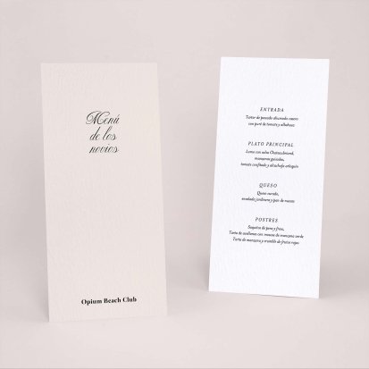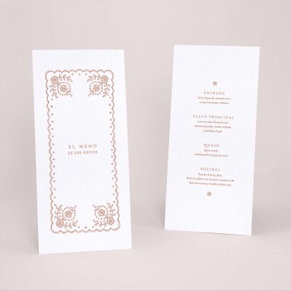 Una vez decidido el menú de tu boda. Imprímelo a juego con tu invitación de boda. Presentados en las mesas, completarán de forma ideal la decoración y vuestros invitados, se llevarán un bonito recuerdo de vuestro convite. Os aconsejamos un menú por persona: puedes colocarlo en el centro del plato junto con el marca sitio.