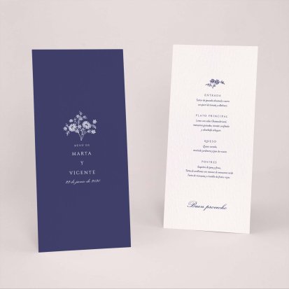 Una vez decidido el menú de tu boda. Imprímelo a juego con tu invitación de boda. Presentados en las mesas, completarán de forma ideal la decoración y vuestros invitados, se llevarán un bonito recuerdo de vuestro convite. Os aconsejamos un menú por persona: puedes colocarlo en el centro del plato junto con el marca sitio.