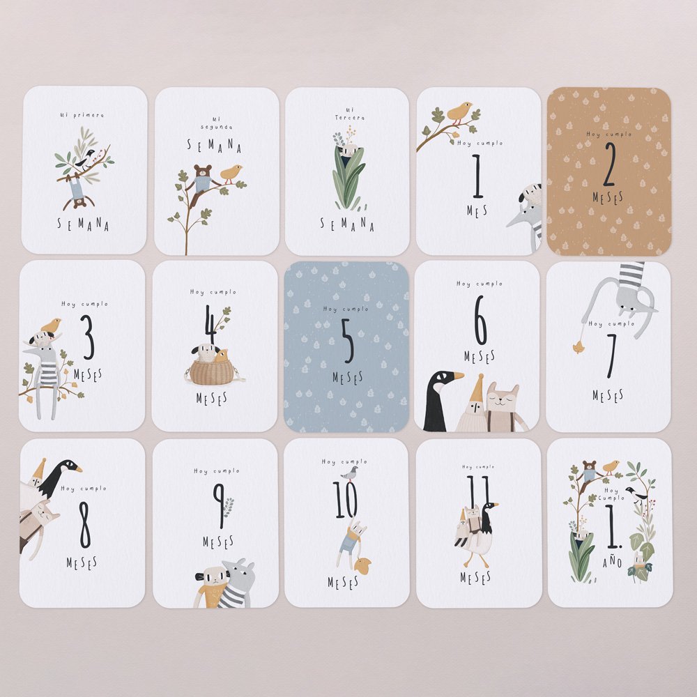 El primer estuche incluye 15 tarjetas (de 1 semana hasta 1 año) impresas a 1 cara y el dorso pensado para que los papás anoten los progresos del bebé.