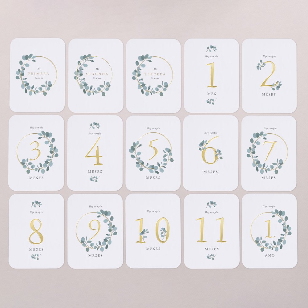 El primer estuche incluye 15 tarjetas (de 1 semana hasta 1 año) impresas a 1 cara y el dorso pensado para que los papás anoten los progresos del bebé.