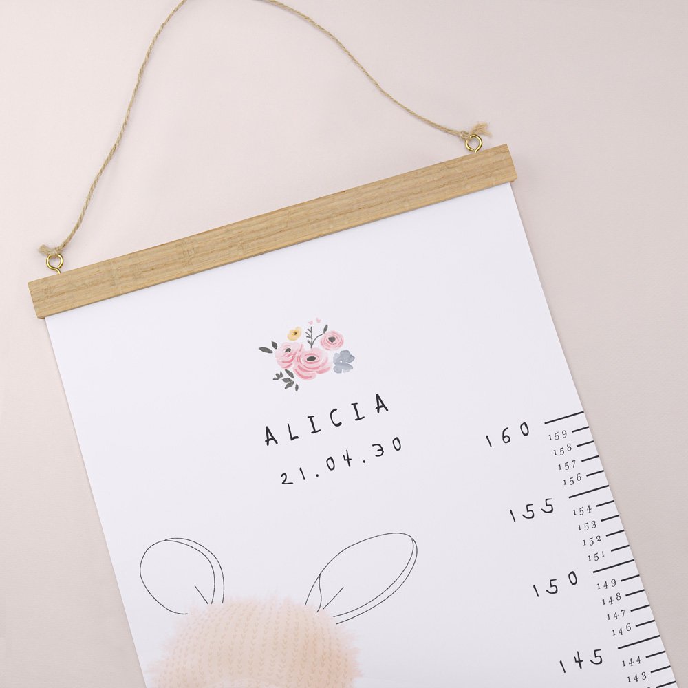 Sigue con ternura el crecimiento de tu peque, año tras año, con esta preciosa regla de altura ilustrada. Graduada de 55 a 160 cm, puedes personalizarla con el nombre de tu hijo o hija. Una bonita idea de regalo para ofrecer o regalarse, perfecta como decoración de pared en la habitación del benjamín de la familia.