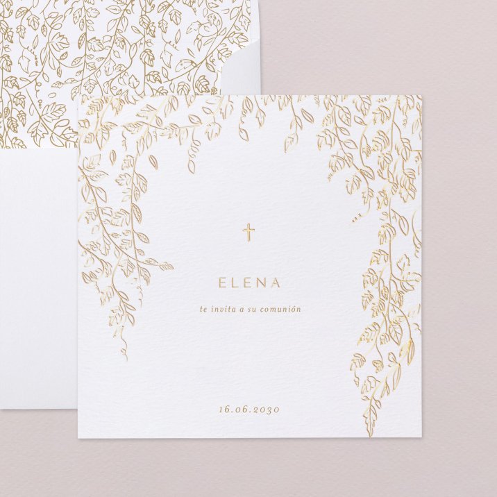 Adornada con delicadas plantas, la invitación Ramas de oro dibuja un elegante cuadro para la Comunión de tu hijo. Un modelo simbólico refinado en oro, que tendrá el efecto más bello al invitar a tus invitados.