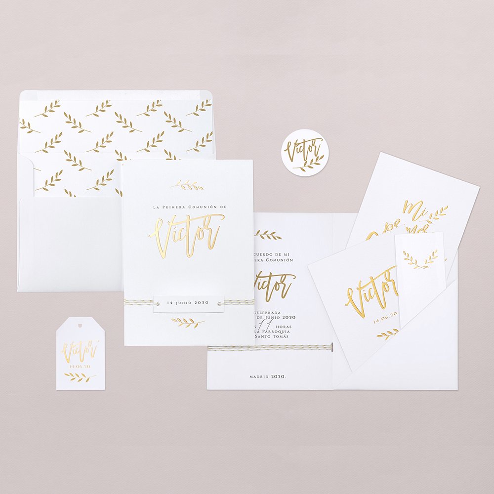 Este modelo se presenta en forma de carpeta. Incluye una invitación, un fotomatón y dos tarjetitas para personalizar a tu gusto: programa, informaciones importantes, etc. Todo ello se coloca en la solapa interior y se sujeta con un lazo o un cordón a elegir.