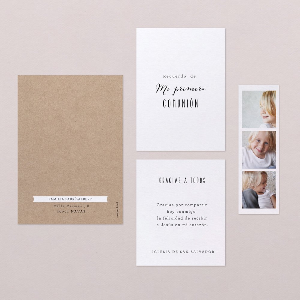 Este modelo se presenta en forma de carpeta. Incluye una invitación, un fotomatón y dos tarjetitas para personalizar a tu gusto: programa, informaciones importantes, etc. Todo ello se coloca en la solapa interior y se sujeta con un lazo o un cordón a elegir.