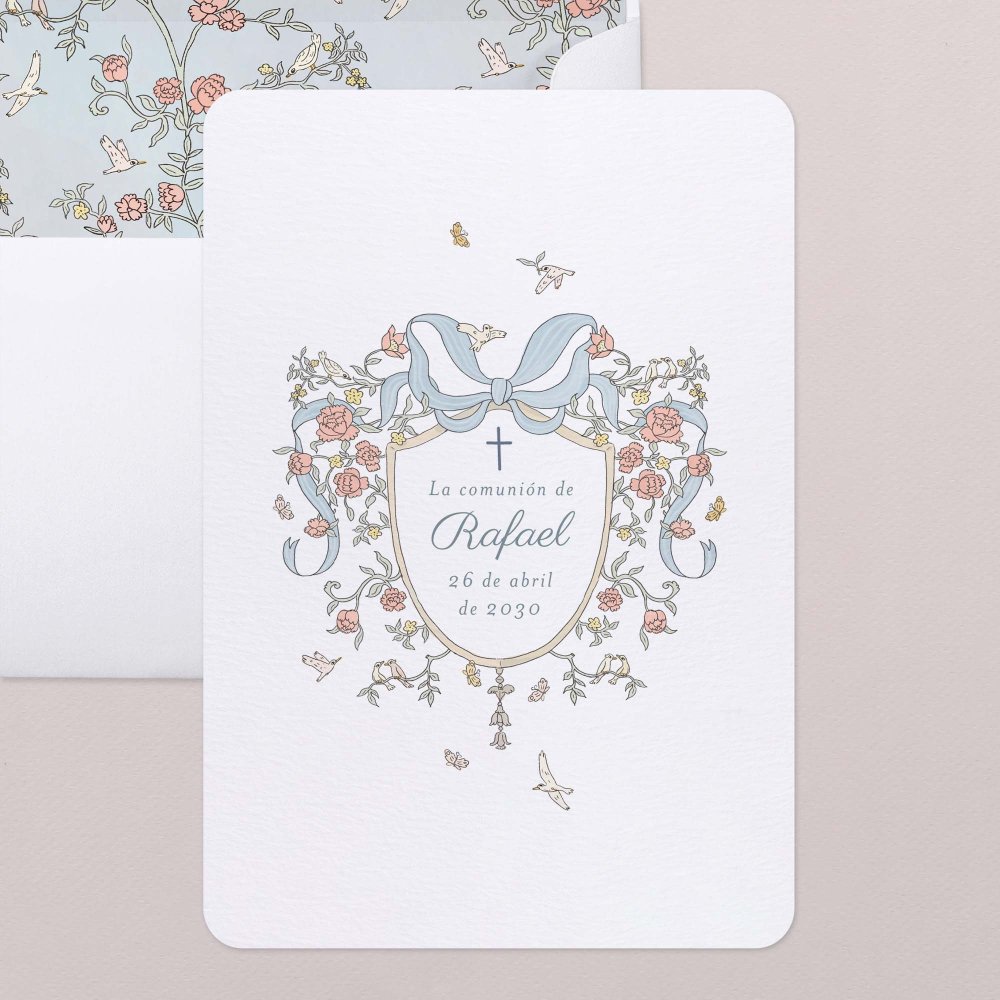 En la invitación de comunión Arthur el nombre de tu pequeño destaca sobre un conjunto de flores rosas y amarillas, mariposas y pájaros. Una creación única con estilo vintage, ideal para anunciar la comunión de tu niño o niña, con un toque original.