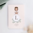 En la invitación Rosario, la inicial del nombre de tu peque es el centro de toda la atención. Delicadas notas vegetales y tu niña con un vestido de Comunión completan esta adorable invitación.