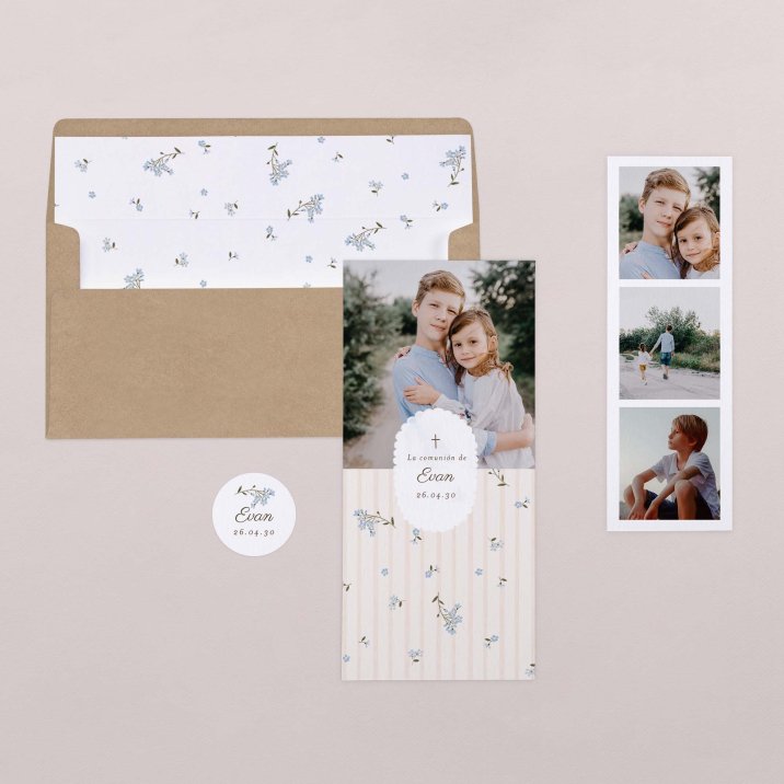 Delicadas flores de myosotis azules sobre la invitación de comunión Myosotis. Una creación poética llena de dulzura, perfecta para anunciar la comunión de tu peque en primavera o en verano.