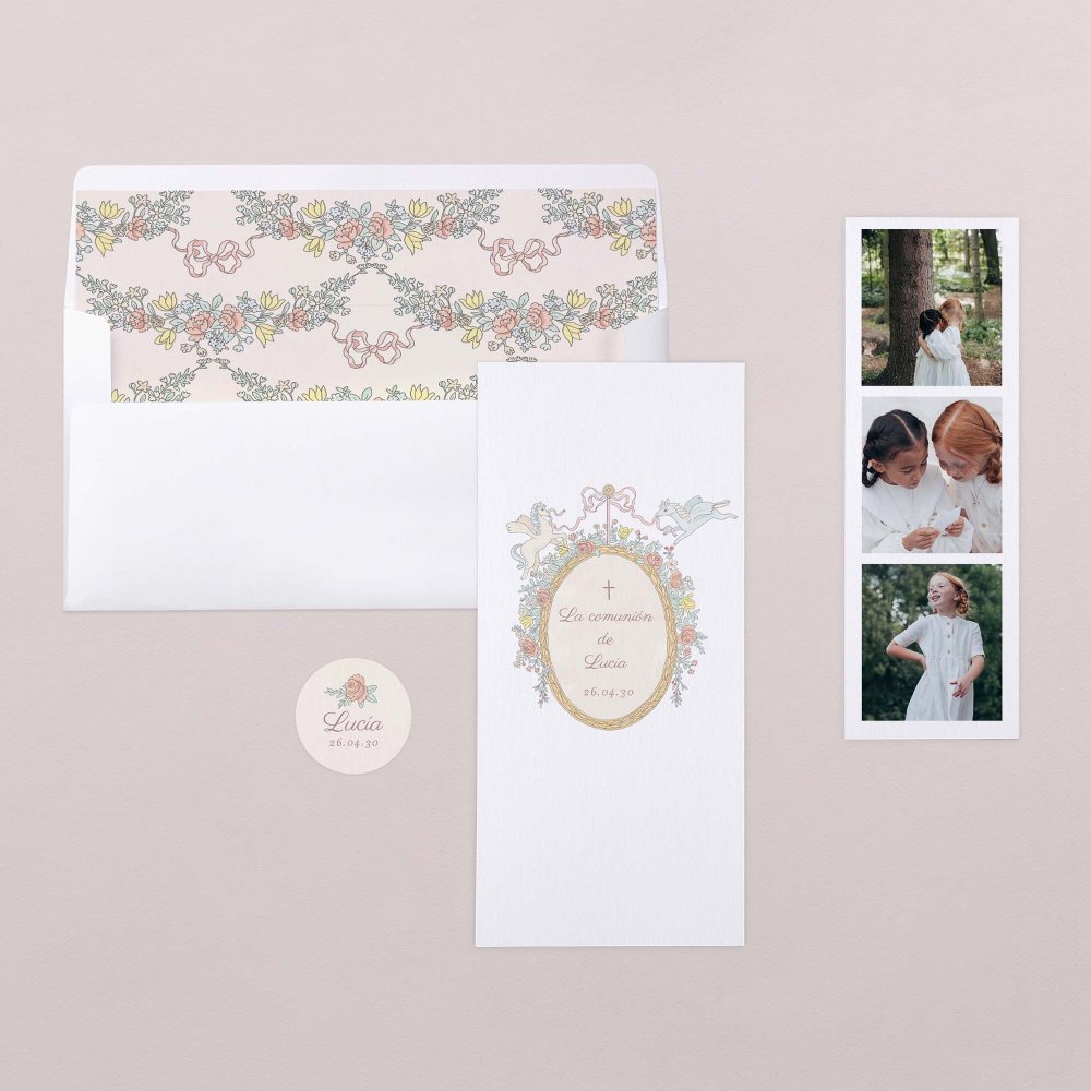 Un universo de fantasía en tonos pastel cobra vida en la invitación de comunión Medallón encantado. Un unicornio alado, una jirafa, un elefante, un zorro y otros adorables mensajeros se reúnen en esta creación de encanto vintage, anunciando con infinita ternura la comunión de tu niña o niño.