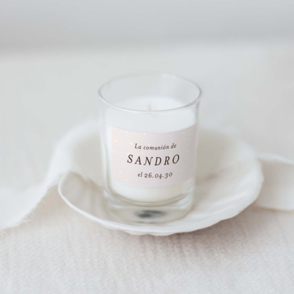 Regalad a vuestros invitados un delicado y perfumado recuerdo de la comunión de vuestro pequeño: la vela personalizada con toques afrutados.