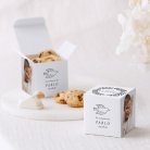 Tampoco vienen con el contenido. Como sugerencia podéis rellenarlas con nuestras peladillas elaboradas artesanalmente en el sur de Francia (propuestas como accesorio por separado). Os aconsejamos llenarlas con 20 peladillas por caja (50 g).