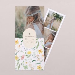 Fresca y primaveral, la invitación de bautizo Lilly Rose se viste de narcisos, violetas, diente de león y otras flores coloridas. Escondidas entre ellas hay pequeñas abejas que hacen que esta invitación sea ideal para una celebración de bautizo en primavera o en verano.