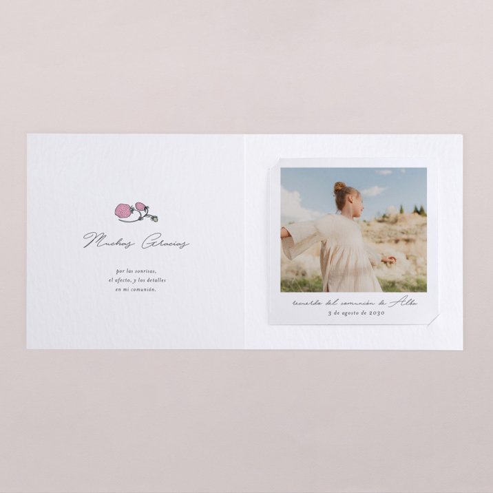 Impresa en papel mate premium texturizado para darle un toque vintage (indicamos no es papel fotográfico). La polaroid se coloca en el interior del díptico de la tarjeta.
