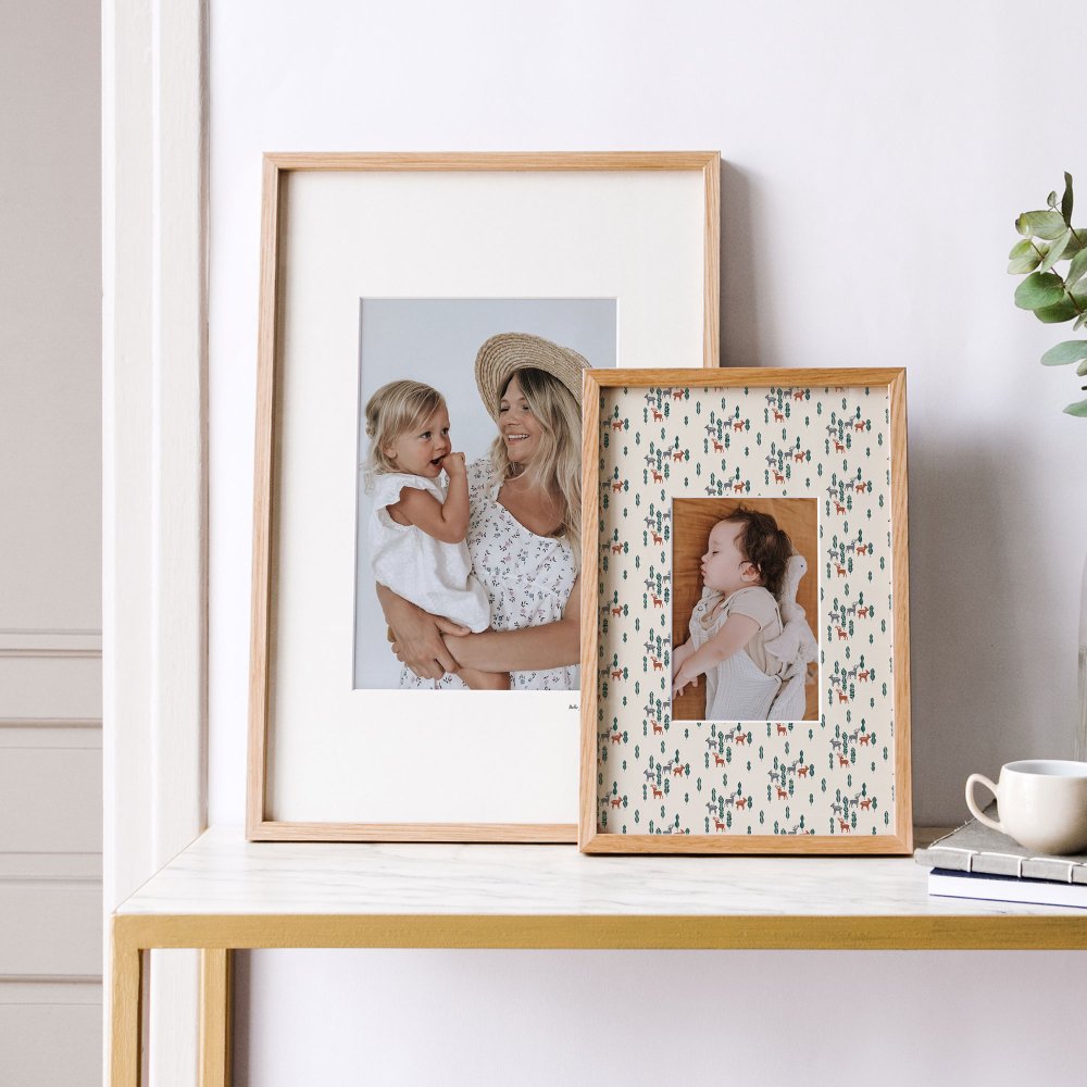 Impresa en un papel fotográfico de alta calidad, tu foto favorita (en horizontal o en vertical) se destacará gracias a nuestro paspartú con motivos originales. Su cuadro en cristal y su marco en roble darán a tus fotos un acabado digno de una galería de arte.