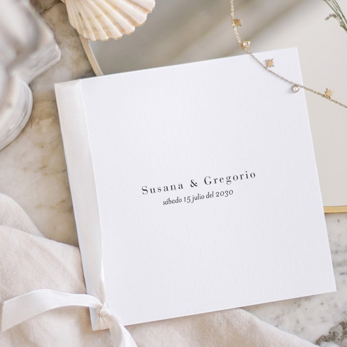 Invitación impresa en cartulina mate de 280 grs. Se sirve con una hoja interior del mismo papel, pero mas fina (120 gris), y se ata con un lazo liberty a elegir (no incluido en el precio).
