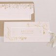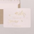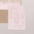El anuncio de vuestra boda aparece realzado en dorado en la invitación Metropolitan. Adornos vegetales, flores silvestres ilustradas y tipografía dorada se combinan para una ceremonia elegante con temática campestre.