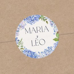 El imprescindible tema floral se reinventa con modernidad en la invitación de boda Hortense. Una hermosa corona de flores en tonos azules se dibuja en esta creación, perfecta para marcar el tono de una boda campestre chic y colorida.