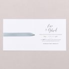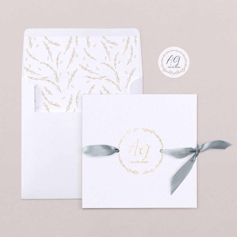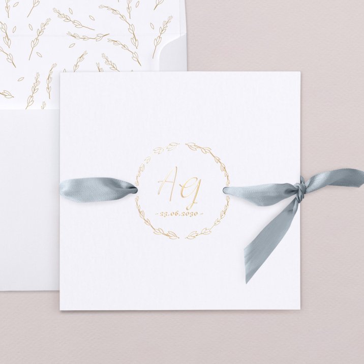 Invitación de boda en papel de alta calidad, de tacto aterciopelado y acabados en oro. En la cubierta vuestras iniciales y la fecha resaltarán gracias al acabado oro. Decorado con una elegante cinta de tafetán gris azulado (no incluida en el precio). Imprimiremos vuestro texto en el interior de la invitación.