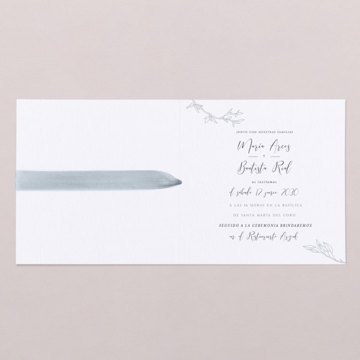 Invitación de boda en papel de alta calidad, de tacto aterciopelado y acabados en oro. En la cubierta vuestras iniciales y la fecha resaltarán gracias al acabado oro. Decorado con una elegante cinta de tafetán gris azulado (no incluida en el precio). Imprimiremos vuestro texto en el interior de la invitación.