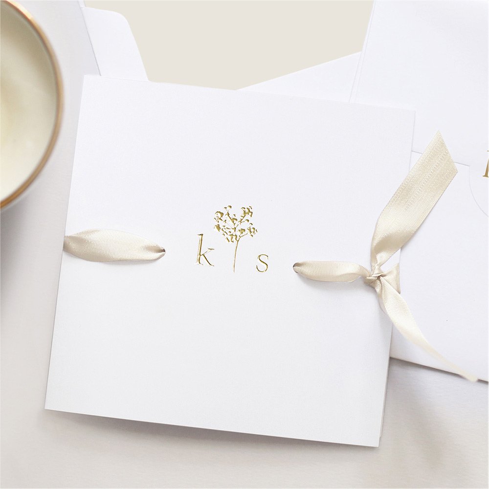 Invitación de boda en forma de díptico elaborada en papel acuarela de 280 gramos, sutiles motivos florales y acabados en oro para la portada. Puedes personalizar tu texto en la portada e interior.