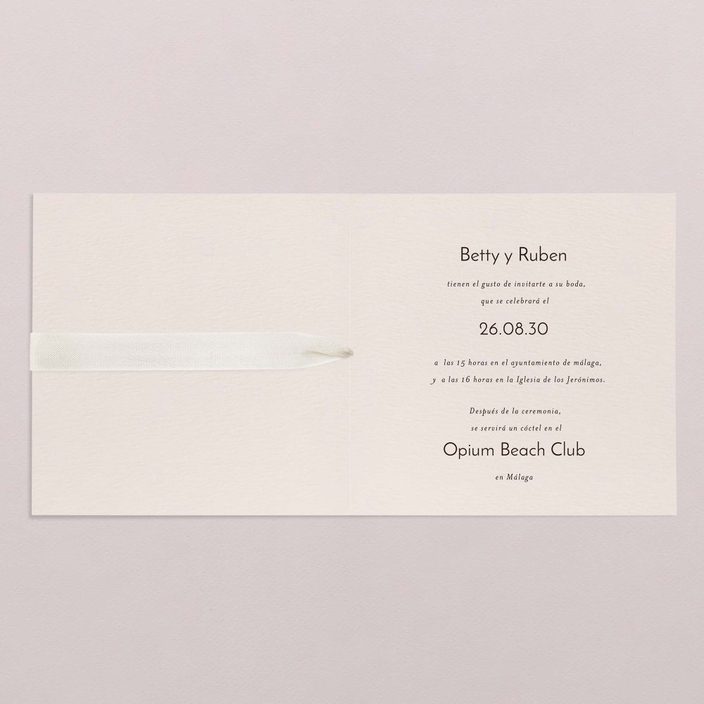 Esta invitación de boda es un díptico cuadrado.