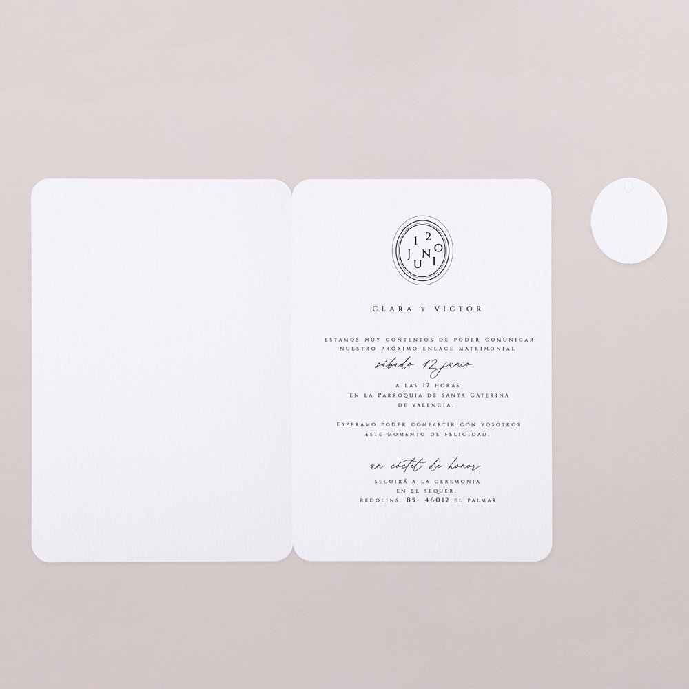 El formato de esta invitación es un díptico vertical. Sus bordes redondeados suavizan su corte clásico. Viene acompañado de una etiqueta redonda personalizada que se puede atar con un bonito cordón o un lazo (propuesto como accesorio a comprar aparte).