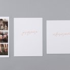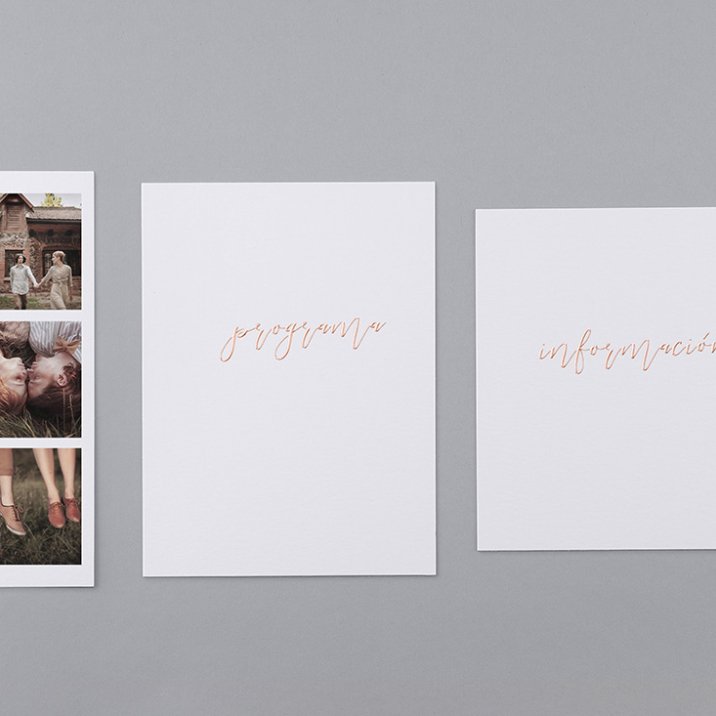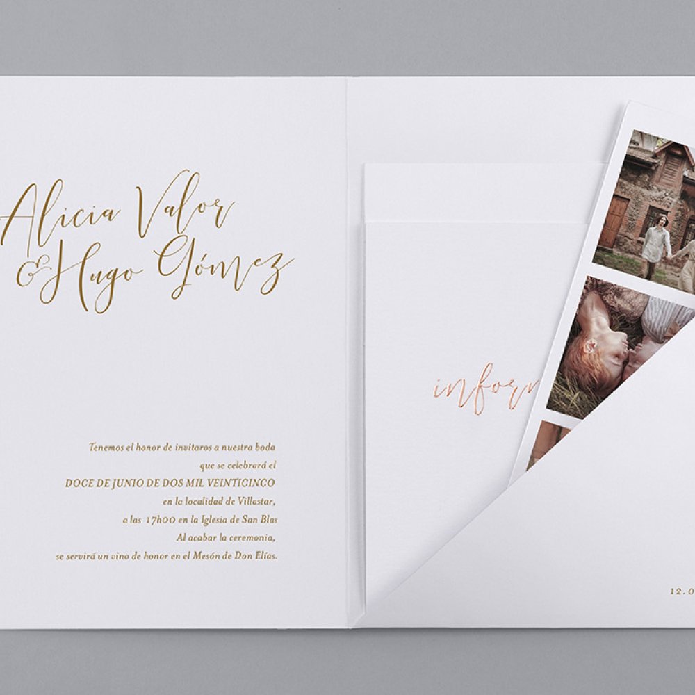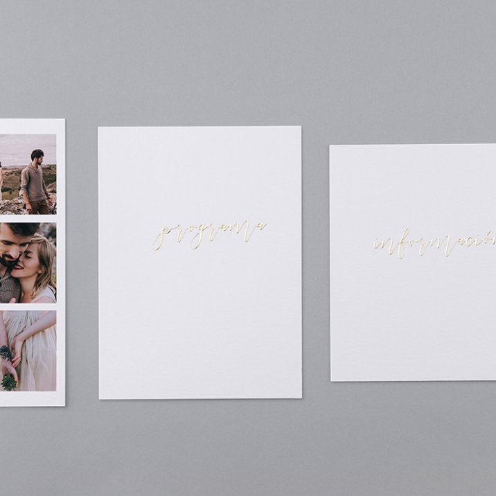 El modelo pocket incluye una invitación de boda en formato díptico, un fotomatón y 2 tarjetas para información adicional (para el programa, la cena, hoteles, mapas...).