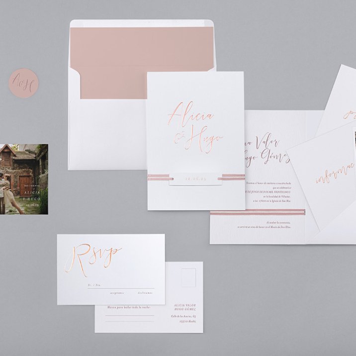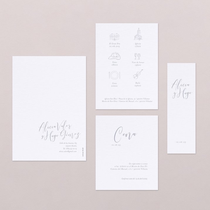 Elaborada en papel SOFT TOUCH con efecto satinado y acabados en plata para vuestros nombres en la portada.