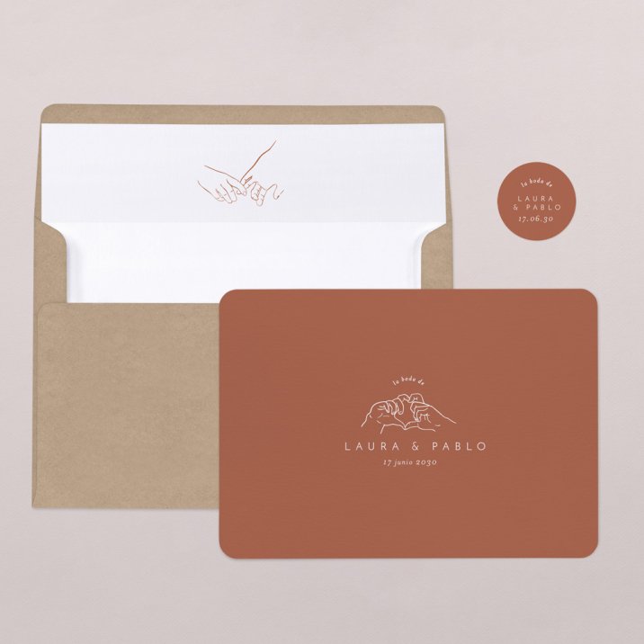 Dos manos representando un corazón, un símbolo romántico y cariñoso... Invita a tus familiares y amigos con esta original y divertida tarjeta de boda.