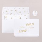 Letras elegantes y motivos florales en acabado oro en la invitación Flor de Naranjo II, un modelo muy atractivo para anunciar vuestra boda de forma especial.