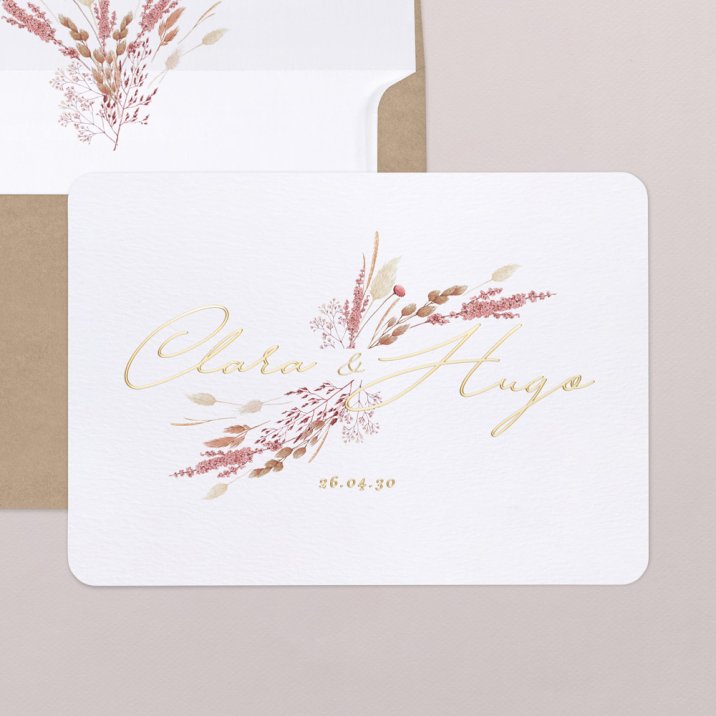Si os gusta el tema campestre os encantará la delicadeza de la invitación Ambrosia III. La combinación de una caligrafía en oro con la ilustración de motivos de flores en tonos cálidos le dan un toque encantador para anunciar vuestro enlace.