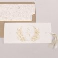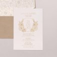 Elegantes detalles dorados en la invitación de boda de l'Estate. Las iniciales de vuestros nombres unidas por una corona de flores adornarán esta creación en oro.