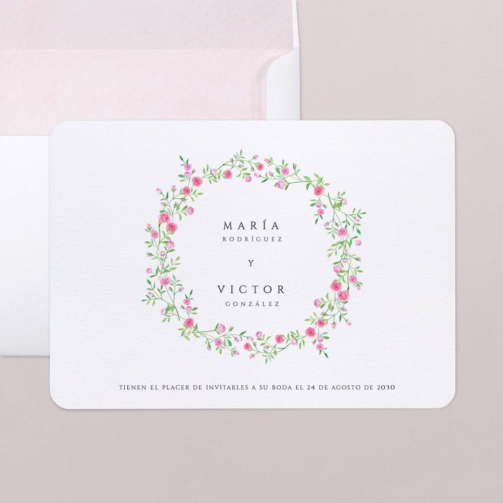 En la invitación de boda Round Romance, una delicada corona de flores rosas en acuarela realza su feliz anuncio. Esta papelería, refinada y romántica, narrará con ternura tu próxima unión.