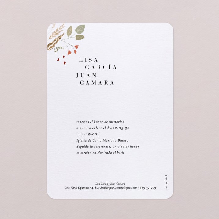 Invitación de boda original y elegante con los cantos rondos, podrás personalizar la cara y el dorso.