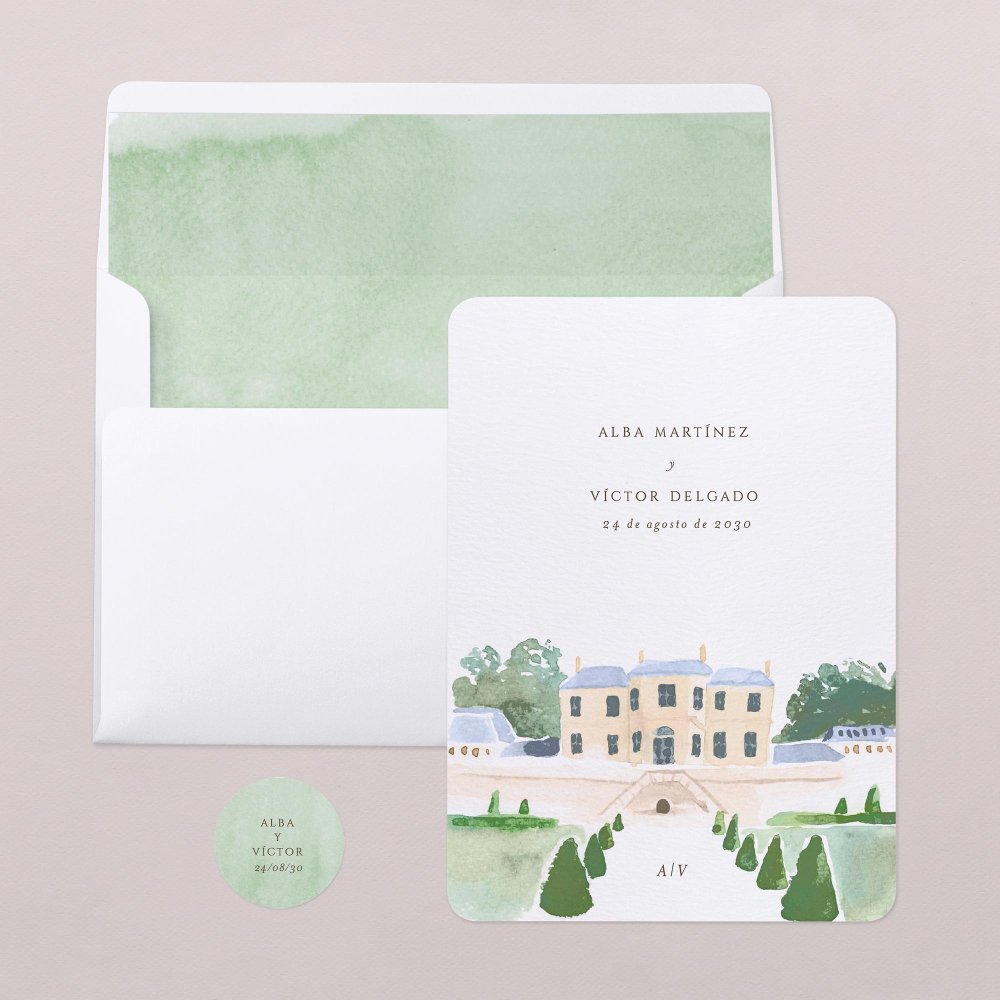 Esta invitación es un tarjetón con los cantos redondos, formato vertical.