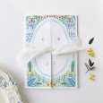 Una preciosa ilustración en acuarela en la invitación de boda Blue Garden: un jardín decorado con finas ramas, macetas y flores en varios colores sobre esta creación, un toque poético para anunciar vuestra boda.