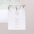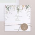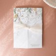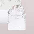 Delicados follajes y pequeños pájaros se ilustran en la invitación de boda Tonnelle: un cuadro sutil adornado con vuestras iniciales caligrafiadas, perfecto para anunciar una boda de tema campestre.