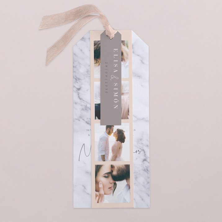 Una invitación de boda de tipo marca-páginas, compuesto de 3 tarjetas personalizables en cara y dorso. Pueden unirse gracias a nuestros lazos y cordones (disponibles como accesorios).