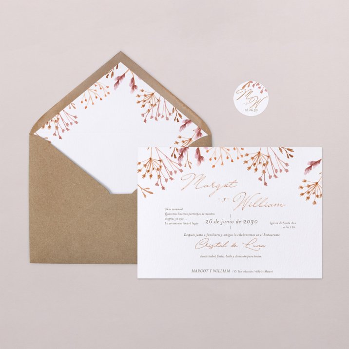 Ilustración de flores silvestres, vuestros nombres en una bonita tipografía y todo impreso en relieve cobre... La invitación de boda Arboretum es ideal para una boda elegante y bohemia.