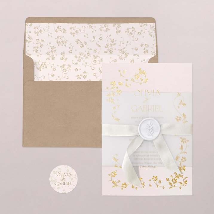 Vuestro anuncio, realzado con motivos florales y letras doradas, será el centro de atención en la invitación de boda Bizet. Un modelo vintage muy elegante.