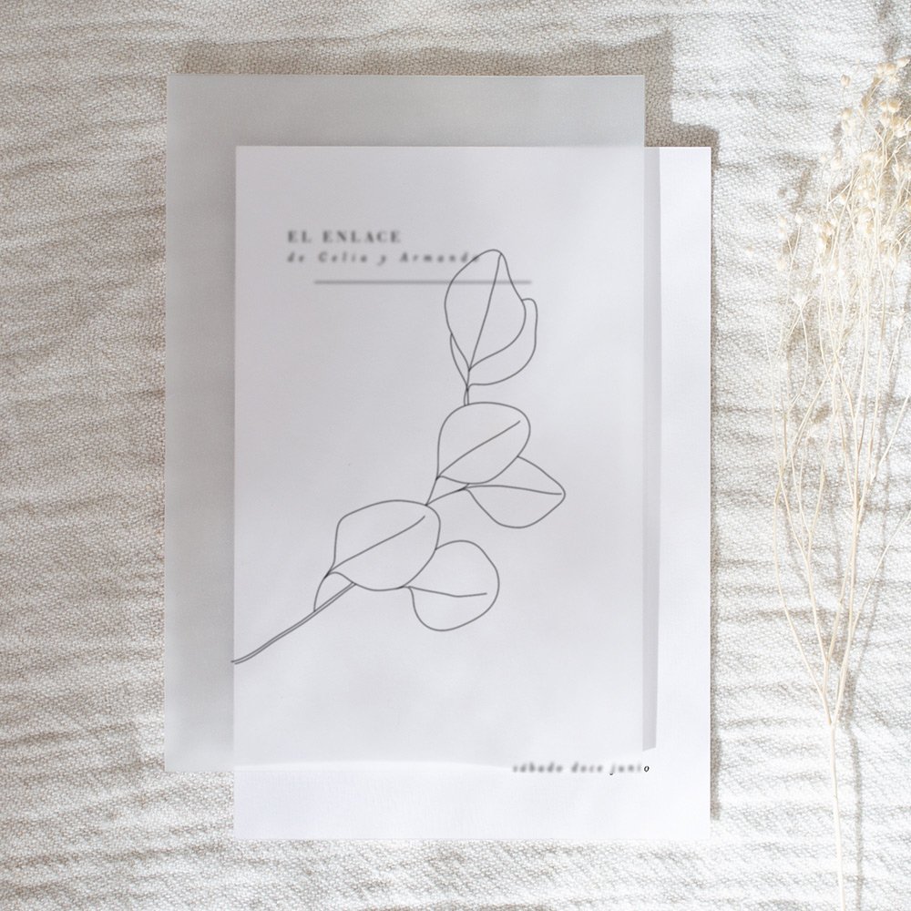 Ideal para cualquier tipo de boda la invitación Pilea lleva un papel vegetal con una rama impresa y dentro quedará el tarjetón con toda la información de la boda. Un diseño atemporal y moderno.