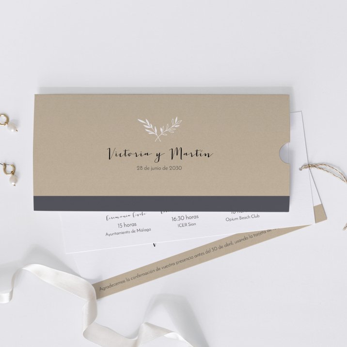 Invitación de boda en cartulina mate de 280 grs, adornado por una faja y una etiqueta. Se puede completar con un lazo a elegir ( no incluido en el precio). Imprimiremos vuestro texto en el interior de la invitación.