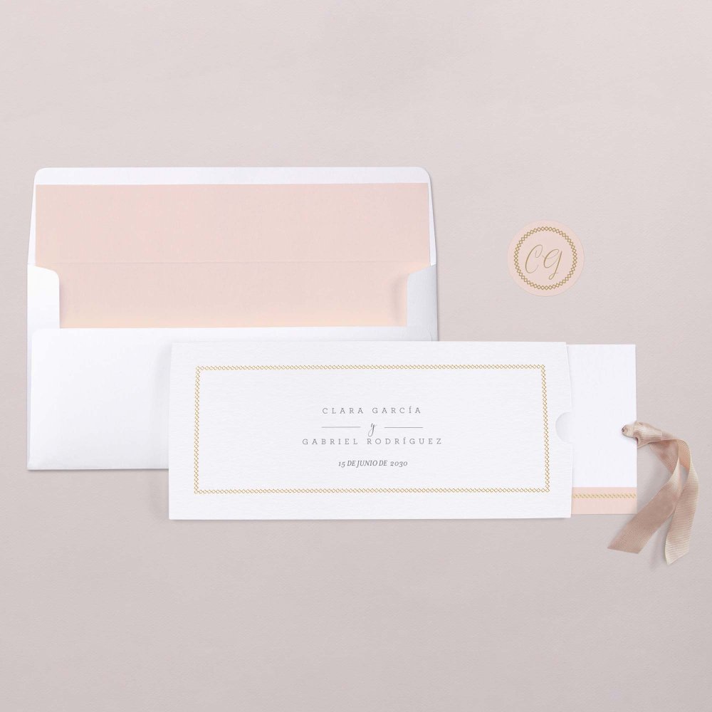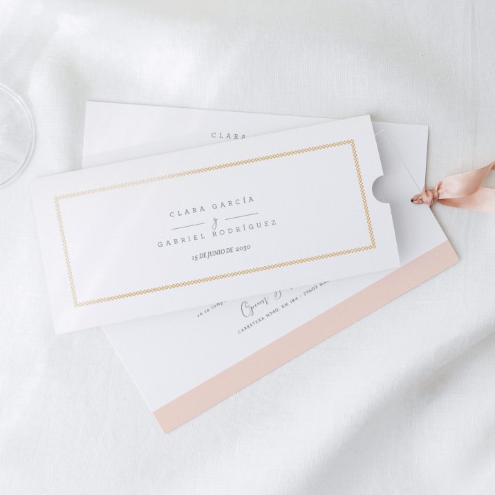 Invitación de boda en papel de alta calidad, de tacto aterciopelado y acabados en oro. En la etiqueta vuestros nombres y la fecha resaltarán gracias al acabado oro. Esta invitación se cierra con una faja y una etiqueta, sujetados por un elegante cinta en tafetán de color rosa empolvado (no incluido en el precio)