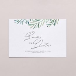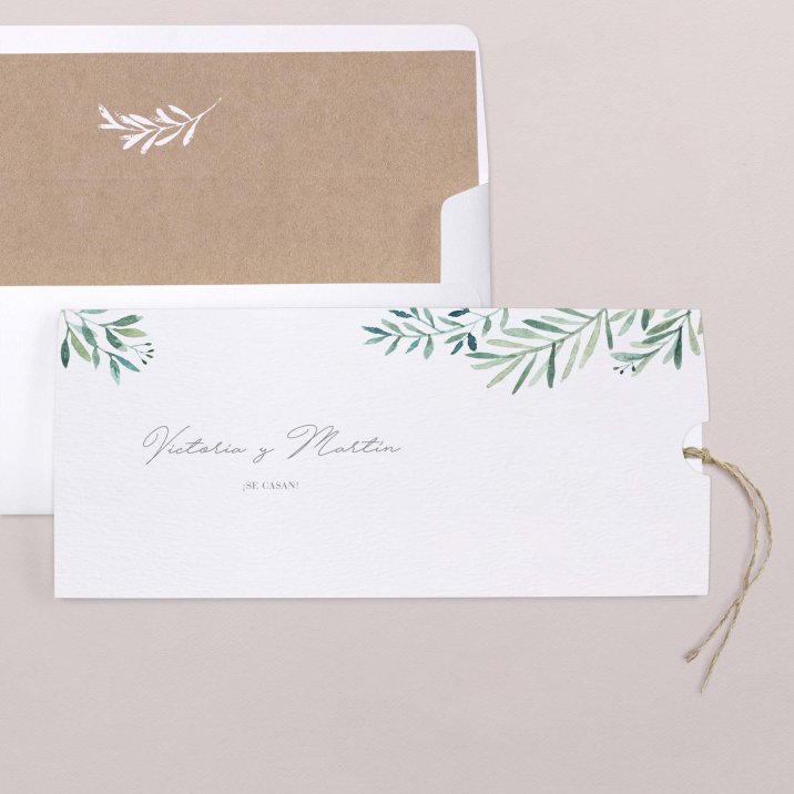 Invitación de boda en papel tipo acuarela, con un gramaje 280g, diseño vintage con ramas de olivo, envuelto por una banda blanca, una etiqueta con la fecha de la boda y un lazo (no incluido en el precio).