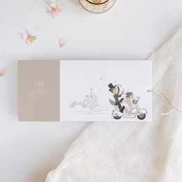 - Ilustraciones: Novios, scooter, ramo de flores, pueblo, árbol, iglesia