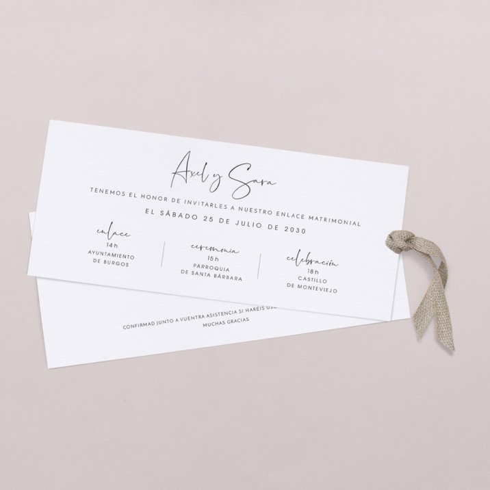 Esta invitación incluye dos tarjetas y una carpeta para incluir dentro las tarjetas. Para darle un toque más elegante, incluye un bonito lazo (a elegir y no incluido en el precio).