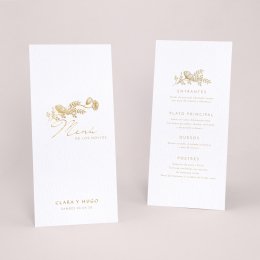 Letras elegantes y motivos florales en acabado oro en la invitación Flor de Naranjo II, un modelo muy atractivo para anunciar vuestra boda de forma especial.