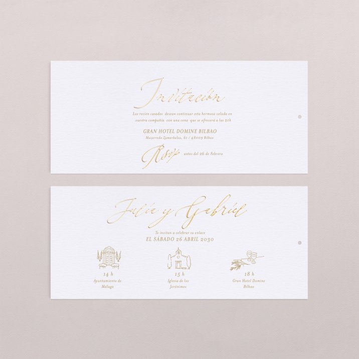Los amantes de las letras se dejarán seducir por el modelo Alassio, un anuncio de boda sobrio y refinado que destaca por su elegante caligrafía resaltada en oro.